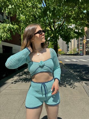 The Delara Top is a stunning long-sleeve crochet crop top with unique rose and mesh details. Pair with the Delara Shorts Crochet Pattern to complete the set!