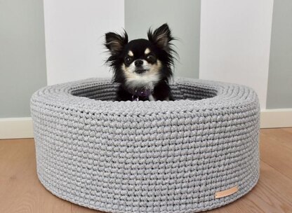 This crochet pattern contains both pictures and text describing how to crochet and fill the dog bed, and if needed how to increase its size. Materials: • Hook size 10.00 mm (N/P-15) • 5-7 x 500 grams of fabric yarn (For example “Hoooked Zpagetti yarn”) • Foam rubber, I used a thickness of 7 cm (2 ¾ in.) • Scissor • Big yarn needle • Stitch marker Abbreviations: • Ch = chain • Sc = single crochet • Slst = slip stitch • Sc2tog = sc the next 2 stitches together (decrease) Dimensions of the finished dog bed: o Inner diameter: 36 cm (14.2 inches), rim width 8 cm (3.15 inches), total height 19 cm (7.5 inches), total diameter 52 cm (20.5 inches) NOTE: The pattern includes a detailed description on how to increase the size of the dog bed. Language: English (The pattern is written in standard American terms.)