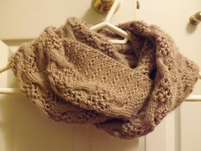 Delicate is a soft knit, double-loop infinity scarf that can be worn a number of ways. The piece is worked flat, end to end, from a long-tail cast-on. Its ends form a circle by seaming live stitches to the cast-on edge.