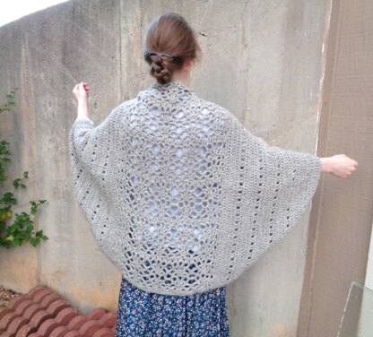 A pretty scallop lace back panel makes a dramatic focal section on this cozy oversized cocoon shrug.