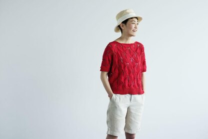 A breezy summer top with a bold lace motif, knit in bulky cotton yarn. It's such a quick knit -- you will have a cute top to wear in no time! Summer is the time to play with bright colors, so choose colors such as red, blue or orange. It's a perfect match for a pair of linen shorts.