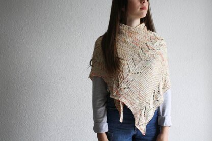 “Brushwood” est un shawl triangulaire, tricoté dans le biais. Son point de dentelle en épine se tricote sur chaque rg (endroit et envers) et offre un joli contraste avec les sections de point mousse.