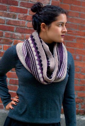 Wrapped once, twice or three times around your neck this playful four-color cowl is as much fun to wear as it is to make. A simple pattern of stranded colorwork diamonds embellishes one edge, followed by lively garter stitch stripes. Gauge is given for garter stitch since most of the cowl is worked in garter stitch. It may be necessary to change needle sizes to match the stitch gauge of the colorwork diamonds to the garter stitch.
