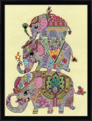 Kreuzstich Set mit Zählmotiv „Elefantentrio“ Set-Inhalt: Cremefarbener Aidastoff mit 5,4 Stichen/cm (14 count), vorsortiertes, mehrfädiges Baumwollgarn und Vorlage mit Anleitung (verfügbare Sprachen siehe Produktinformationen).
