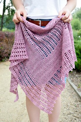 Worked sideways with fingering weight yarn, Despina Shawl has a versatile and wearable asymmetric triangle shape. It starts at the point and grows into a triangular piece by increases along the edge. Because of the simple construction and easy lace, this shawl can be worked in almost any weight of yarn (except lace yarn) with just an adjustment in needle size.