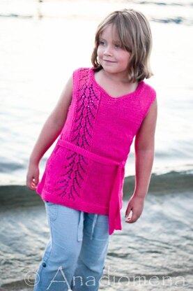 The design features Fountain lace panels and a knitted on belt, though the vest can be made without it as well.