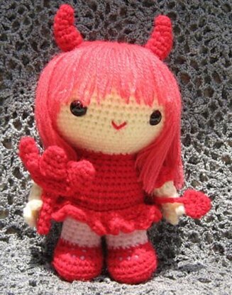 This crochet pattern is written in English (using US crochet terms). It is 6 pages long with very detailed instructions and 14 images to help you make Jazzy and her pitchfork.