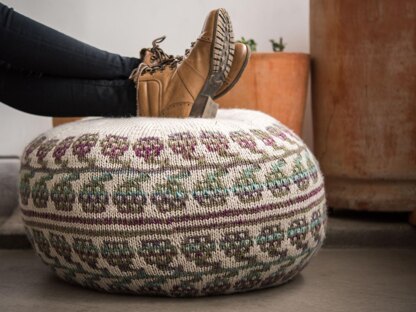 Knit entirely in the round this is a super fun pouf, ottoman, footstool, whatever you'd like to call it! The colorwork is slip stitch mosaic style so it is much easier than it looks, you're only ever working with one color at a time.