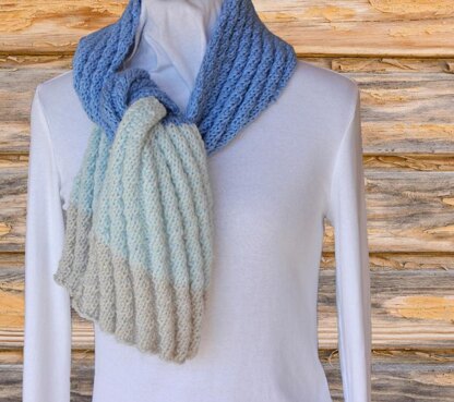This scarf pattern is easy to knit and can be completed quickly. The pattern is knit with size US 9 straight knitting needles and a basic acrylic weight #4 yarn. The yarn used in the scarf photos was Hobby Lobby I Love this Yarn. You will need 3 colors of yarn to create the color blocked look. Basically you can use yarn left from other projects as you do not need a whole skein of each color - exact amounts listed in the pattern. The pattern uses knit and purl stitches to create the pretty diagonal rib.