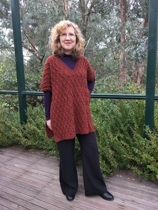 The Diamond Alchemy Poncho is a wool poncho, worked bottom up in an overlapping diamond cables pattern in two pieces, front and back. The elbow length sleeves are worked as part of the front and back pieces.