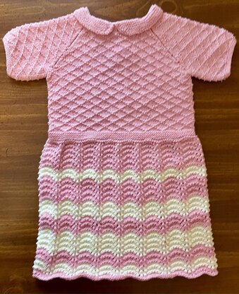 This dress is worked from the waistband up to the neck. The bodice is worked in the Diamond Brocade Pattern and beads can be added. Sleeves are worked separately and added on. Collar is worked later along with the back button band. Stitches are then picked up at the bottom of the waistband for the skirt. The skirt is done in a lace pattern.