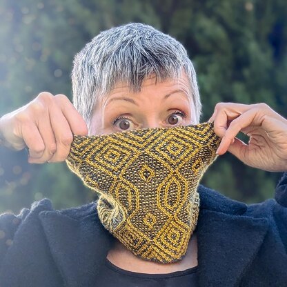 In this intricate cowl the golden yarn weaves delicate, symmetrical patterns over a dark neutral background, reminiscent of golden hour light filtering through a forest canopy. Each motif is framed by bold geometric shapes that evoke both elegance and structure, while the garter stitch base adds texture and depth.