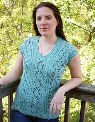 MATERIALS: Cotton Bam Boo by Classic Elite (52% cotton, 48% bamboo; 50 gram ball = approx 130 yards) • 6 (7, 7, 8, 8, 9) balls 3615 Turkish Tile Needles • One 24" circular each size US 3 and 5 (3.25 and 3.75 mm) Or size to obtain gauge • One 16" circular size US 5 (3.75 mm) • Cable needle (cn) • Stitch markers • Stitch holder or waste yarn