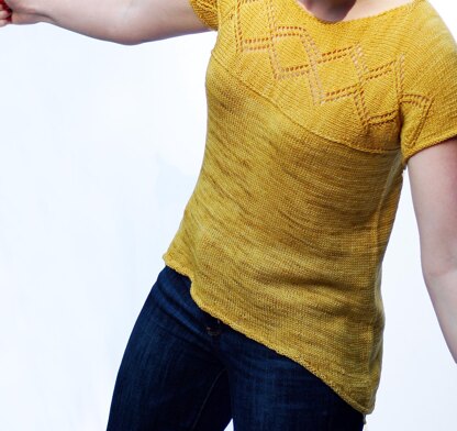 Short rows shape the angled hemline that provides for longer side and back length and also magically creates an A-line shape. The only seams are the very short underarms of the cap sleeves.