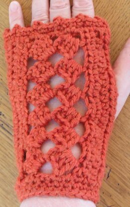 I love this diamond pattern and I have made numerous items with it. This pattern is made lengthways, and you continue adding more rows until they fit your hand The mitts have 2 rows of 6 diamonds and are 16 cm (6¼ in) long. They can be made longer if required. The mitts are designed for 3 sizes: Small 17 cm to 20 cm (6¾ to 8 in) around the widest part of the hand Medium 20 cm to 23 cm (8 to 9 in) Large 23 to 26 cm (9 to 10 in) The pattern is written in English and US crochet terms and is charted.