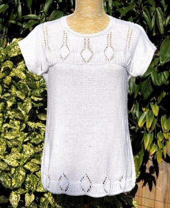 Elegant eyelet diamonds separated by shaped "shell" ribs, on both the back and front, create this beautiful summer top. Borders are reverse stocking stitch and roll under slightly to give the effect of a narrow rouleaux. Perfect in this Bamboo/Cotton yarn. Worked bottom up and with full written instructions.