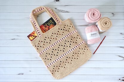 - Sample bag made with WeCrochet/ Knit Picks Dishie (worsted weight). Pattern can be made with yarn of a different weight, but size will vary.