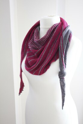 Different Ways is an asymetric and rounded triangle, which is itself created with different triangles, each one playing with different stripes, going different ways, thanks to short rows that will allow each section to assemble in each other.