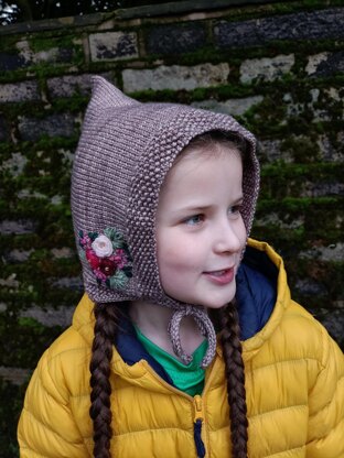 The bonnet it worked using a worsted weight yarn at a slightly tighter gauge than normal as this provides a more stable fabric on which to embroider.