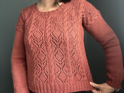 The Dipladénia sweater is a drop-shoulder design knit in the round from the bottom up. It features alternating simple cables and lace diamonds on the body.