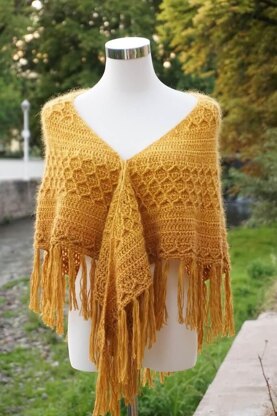 Inspired by sweet slices of honeycomb dripping with honey, this symmetrical rounded triangle shawl pattern features textured bands alternating plain bands of stitches.