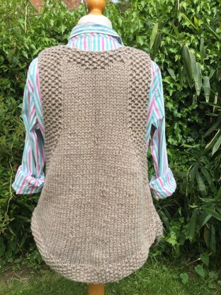This casual yet fashionable waistcoat is knitted on 10mm needles you will see it grow before your eyes. Its a long fit, with narrow front panel to lengthen your shape. and a shirt tail design on the back. The broad moss stitch welt and borders give a distinctive effect but are easy to create within the body of the garment. It is a one size fits all pattern, but particularly tall or short individuals may wish to make slight adjustment to the overall length. Garment in the picture has been made with Sirdar Big Bamboo. the garment is designed to be fastened with a pin as a permanent button or fastening to marry with he chunky design would off balance with weight when left open.