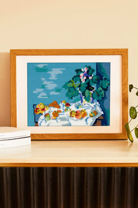 This still-life by painter Paul Cézanne features a tablecloth artistically draped on a table with apples and a vase of primroses. The blue background contrasts with the white of the tablecloth to create a sense of dimension. Lovers of art and tapestry canvas will not be disappointed when stitching this still-life composition.