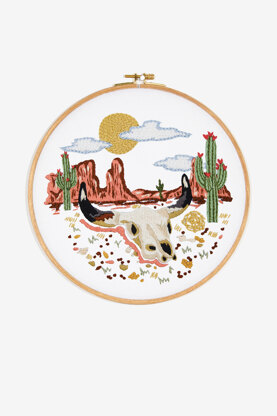 This advanced embroidery pattern features an abundant Wild West desert filled with mountains, cacti and a skull at the forefront. Add this colourful and intricate design to linens, clothing, or display as a framed decoration on your wall. Our patterns and quality supplies make it easy for you to complete your project. Colourfast and fade resistant DMC threads keep stitches looking vibrant for generations to come.