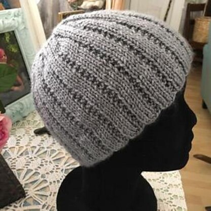 This hat is easy and quick. The pattern is easy to understand and includes sizes to fit child through adult man. The pattern is a garter rib type stitch, so every other round is straight knit! Easy peasy!