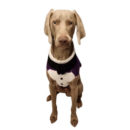 For your fur friend make a very simple dog jumper styled in a dinner jacket style. Pattern contains row by row instructions for small/ medium dog as shown in the images. Includes instructions for main jumper with roll neck and includes finishing touch of a bow tie.