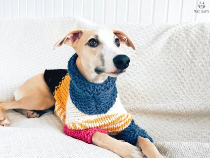 Cozy colourful chunky sweater for your furry (or not so furry) 4 legged friend. Such fun and easy knitting pattern for advanced beginner to follow and there are endless possibilities with 5 colours. This collared sweater is knitted flat and seamed from the sides, choose the perfect fit from 5 different sizes, whippet Pluto wearing the XL size here.