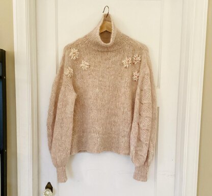 Inspired by the flowers of Dogwood tree, this pullover has a simple, slightly oversized silhouette that is highlighted by balloon style sleeves featuring leaf-like lace, and flower embroidery on the shoulders. Light and airy alpaca yarn knitted at an Aran weight gauge gives this garment drape, without adding any bulk. A fingering or sport weight yarn held together with a strand of mohair can achieve a similar effect. Free-style embroidery done with mohair and fingering weight yarn features glass beads, adding a perfect embellishment. The pullover is knit top-down, seamlessly.
