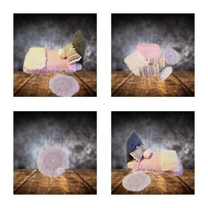 An adorable crochet bedding set for the 18* doll. A beautiful pink blanket to cover your baby doll up, a faux fur across the bottom, 3 pillows for her comfort and a sweet little purple matt for her to keep her toes warm when she gets up. Super easy to do and does not take too long at all. It says for the 18" doll but you can make it for any size doll by just making the size you would like.