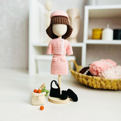 The clothing set contains skirt, jacket, hat, shoes, bag with groceries, purse and removable hair wig pattern for 9" Amigurumi doll. You could also use this set to dress your own dolls, when you adjust hook size to fit your doll.