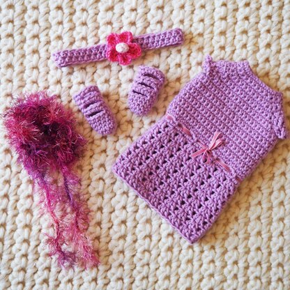 Instructions are given for the dress, shoes, shoes and flower headband.