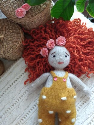 Amigurumi doll knitted: Yarn (you will need about 50g) -Alize Angora Gold 500m/100g-for body (color 599) -Alize Angora Gold 550m/100g-for top part (color 55) -Alize Real40 430m/100g-for trousers (color 40) - North 50m/50g-for hair (color 602) - Hook size 4mm, knitting needles â2