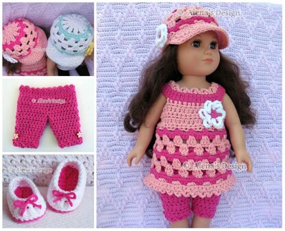 This pattern set is to make a Lace Dress, Capri Pants, Shoes and Visor Hat for American Girl or similar 18 inch doll.