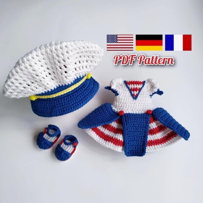 Diese Häkelanleitung enthält eine ausführliche Beschreibung mit vielen Schritt-für-Schritt-Fotos zum Häkeln von Kleidung für die Astrid-Puppe: Kleid, Matrosen Mütze, Sandalen und Höschen.