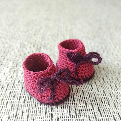 The finishing touch is embroidering around the soles with a blanket stitch. Tied to the front are bows imitating shoe laces.