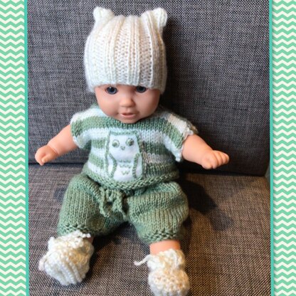 Owl outfit for a doll 12"-14" (31-36cms). Howie loves wearing his owl outfit while he is listening to the hoot of owls at night. The sweater is knitted in one piece, a quick set to knit.