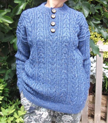 Smart, textured patterning gives wonderful impact to this unisex button neck sweater. The alternating lines of the cable panels are divided by neat twist stitch vertical bands which gives great definition. The sleeves have a centre panel with the rest worked in stocking stitch. There are clear instructions included for both the men’s and women’s version of the buttonhole border. (Pictures shown are man’s version.)