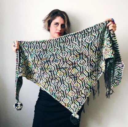 Donita is a thick, cozy triangle shawl with an allover diamond and ladder lace pattern, knit using the two-color brioche stitch. The deep colors and bright speckles combined in this shawl remind me so much of my early days of listening to riot grrl punk bands like L7, Lunachicks, The Gits, Babes in Toyland, and so many more. This shawl is named for the co-founder and lead singer of L7, Donita Sparks, the ultimate feminist punk rocker.