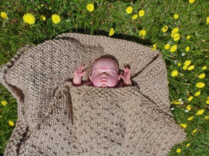 This textured baby blanket knits up quickly and is lovely and snugly. It has moss/seed stitch borders, with a dot stitch body. The pattern is formed by repeating four rows of instructions, making it an easy, quick knit.