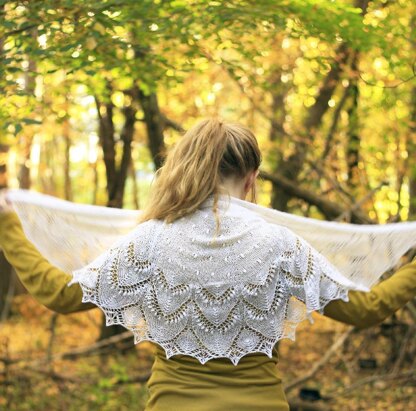 White shawl used 63g JaggerSpun Zephyr Wool-Silk 2/18 [50% merino, 50% silk; 630yd/576m per 57g] on 3.5mm (US 4) needles. Large version with nupps. Blocked size 146 x 68cm (56 x 27 inches). Gauge is 19 stitches per 10 cm in stockinette.