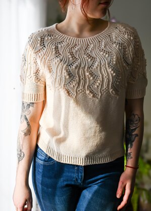 The Dotti Top is a light and airy summer knit designed with comfort and fun in mind. It’s worked seamlessly from the top down using soft fingering weight yarn, and features a yoke full of texture—twisted stitches and lots of little nupps add interest without feeling too fussy.