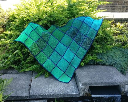 This shawl is knitted in L shapes to create simple garter stitch squares. It is the combination of yarns that create the subtle shading effect.