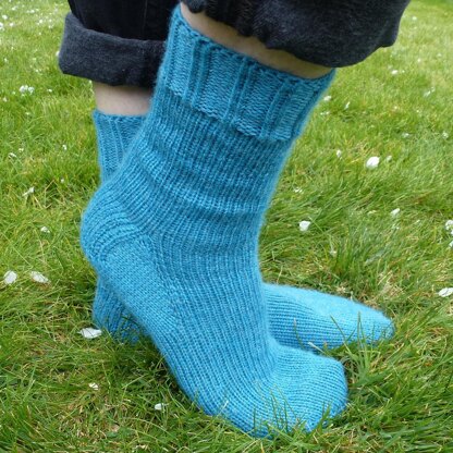 Hiking socks, bed socks, welly socks, taking the dog for a walk when it's freezing cold socks, there are times when you just can't beat a good thick sock. These toe-up socks are a plain design with a heel flap and gusset construction and knit in DK yarn. The heel is turned with German short rows.