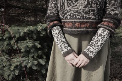 This is a pattern for a pair of cuffs and arm warmers. They are worked from the bottom up and in the round, using the stranded colourwork technique and featuring a folded picot hem at the wrist edge.