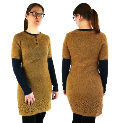 Draconides is a shimmering top-down compound raglan dress that celebrates the annual meteor showers occurring every October. Designed as the fall version of Lyrides, this tunic-length garment has many of the same design elements as the original: a buttoned henley neckline done in twisted ribbing, two options for sleeve length and style, and a delicate lace pattern on the hem.
