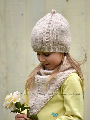 Knitted in stockinette in the round, this fancy Dream Hat and Cowl Set is a must have for incoming winter. Triangular shape cowl designed to keep your little one warm and safe from cold. The set is decorated with vertical garter stitch line The hat is knitted in the round seamlessly. The cowl is knitted back and forth up to shoulders and then finished in the round.